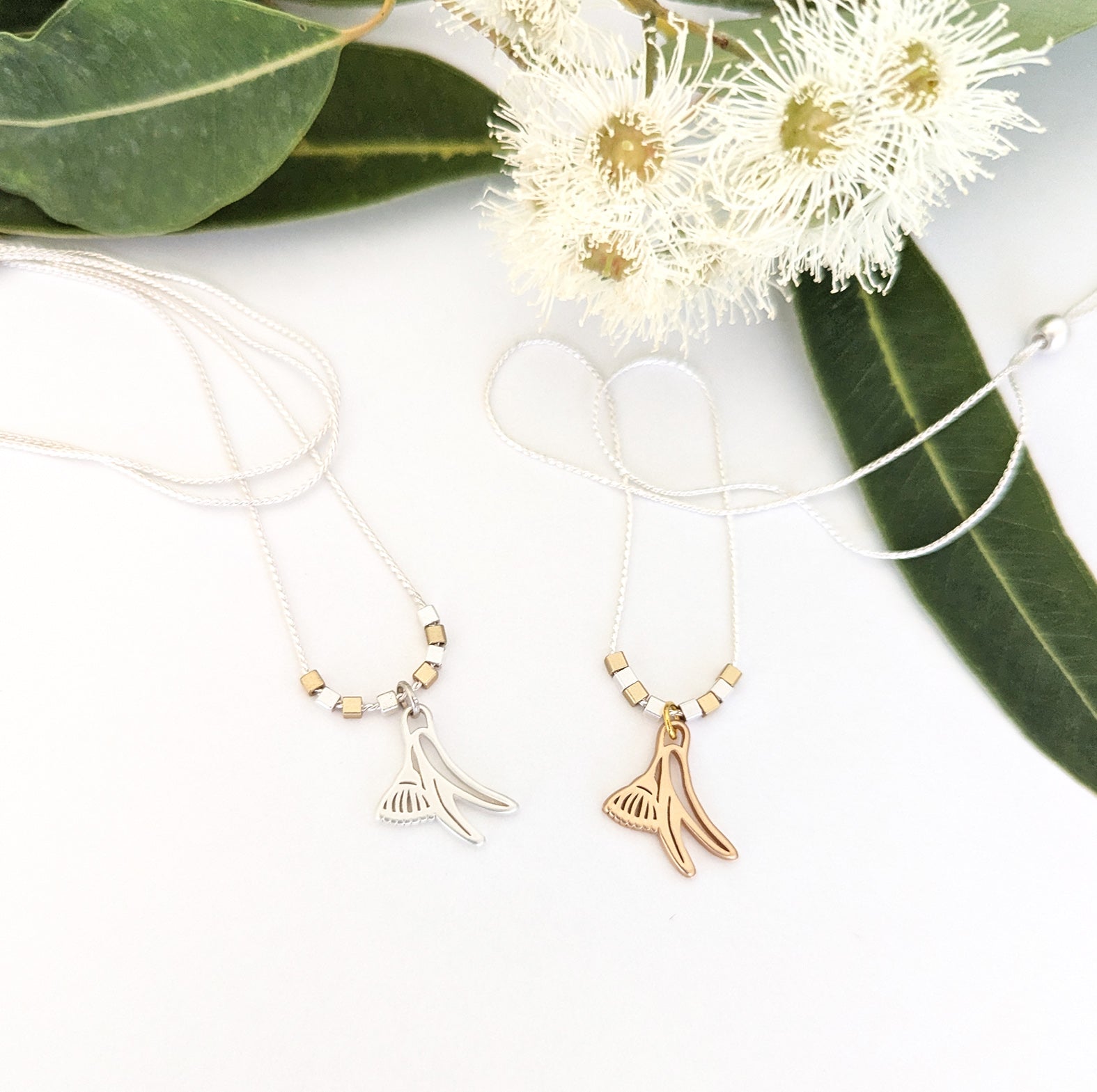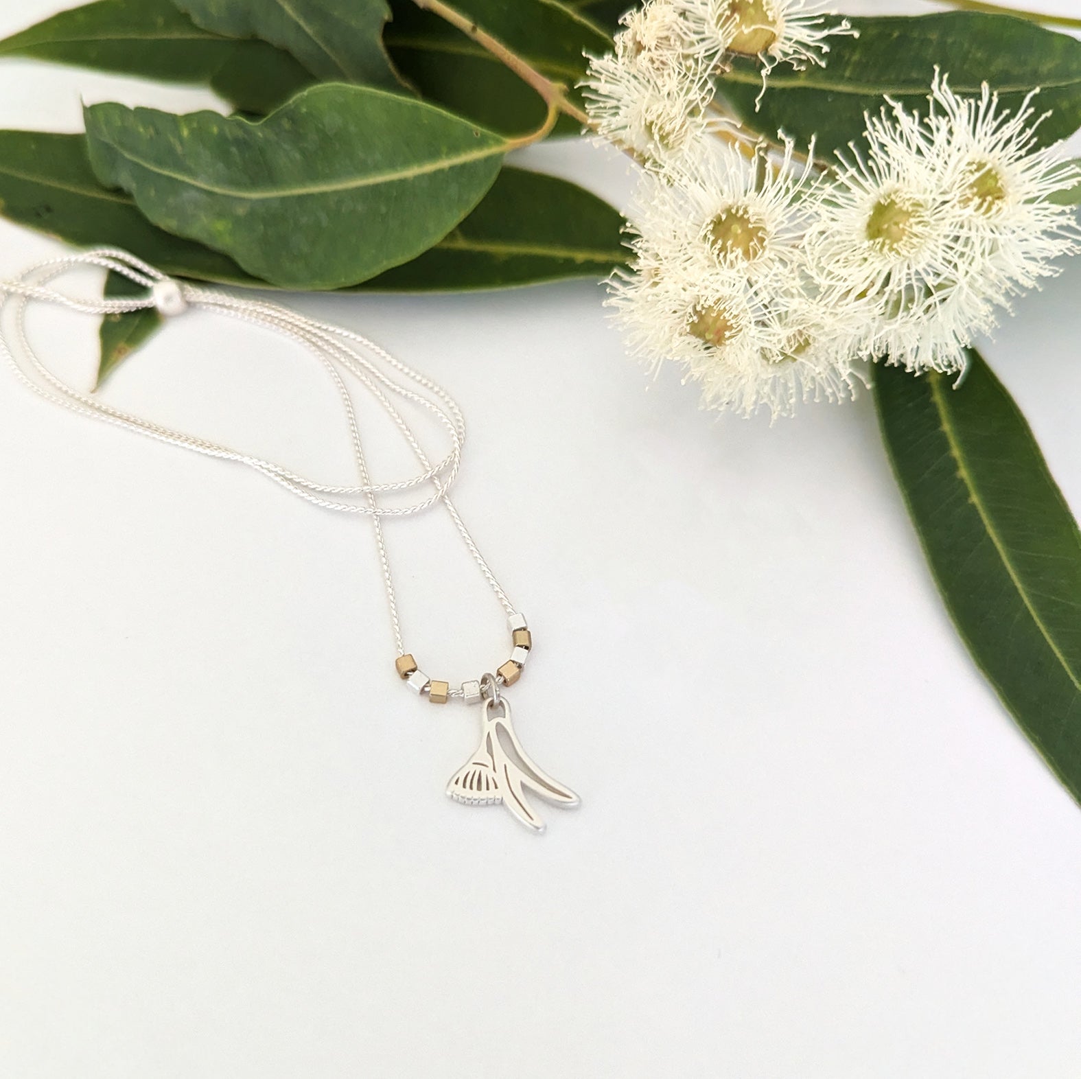 Flowering Gum pendant, tiny square beads and chain are cast in brass (not nickel) and plated in matte silver / matte gold. (chain only available in silver)