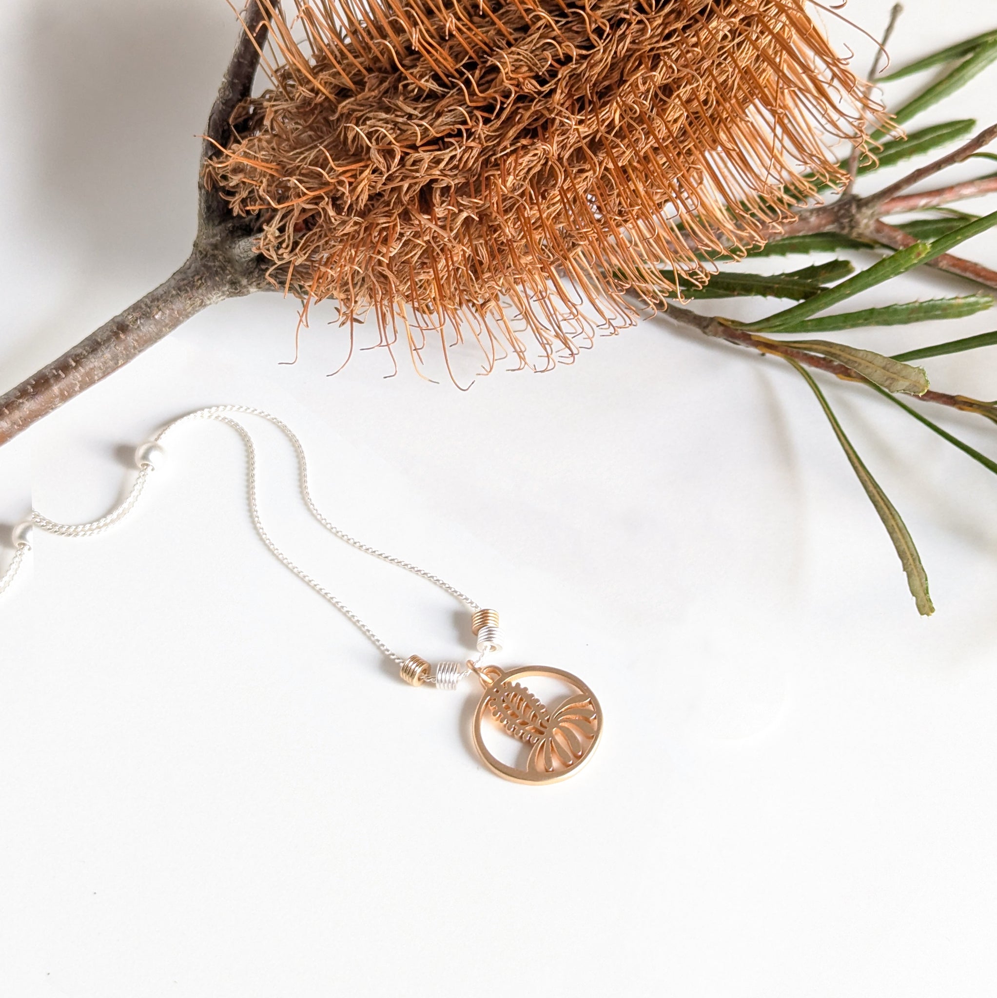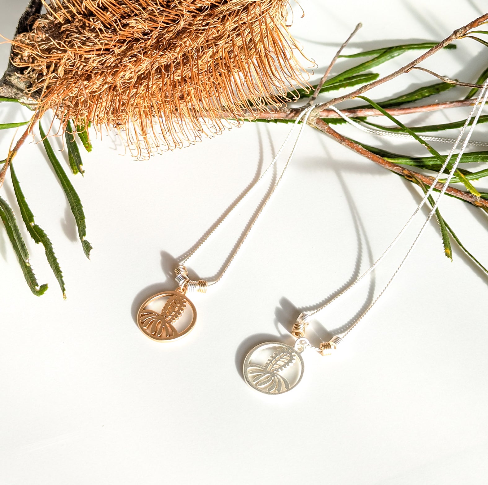 Banksia pendant, beads and chain are cast in brass (not nickel) and plated in matte silver / matte gold. (chain only available in silver)