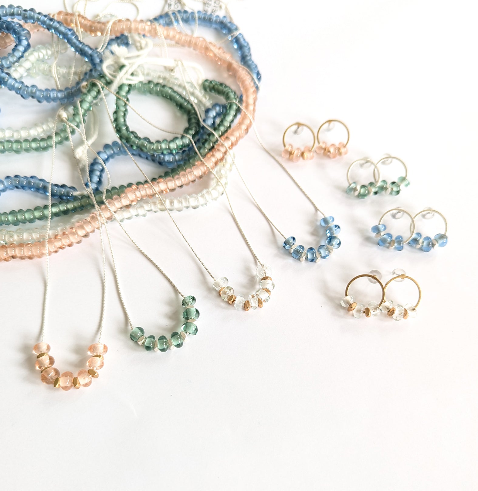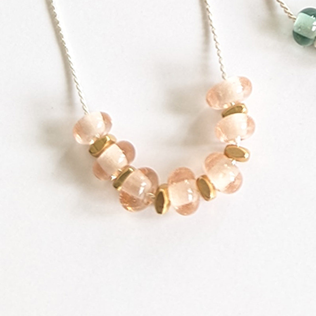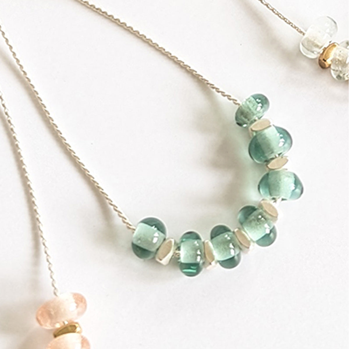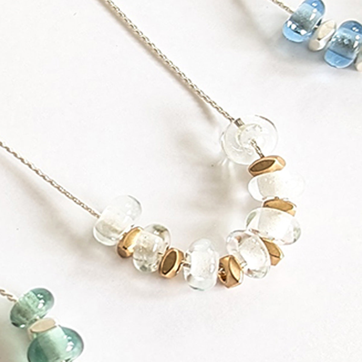 Adjustable ‘slider’ bead (controlling length of necklace) is cast in brass and plated in matte silver/gold at 0.5- 1.0 micron thick.