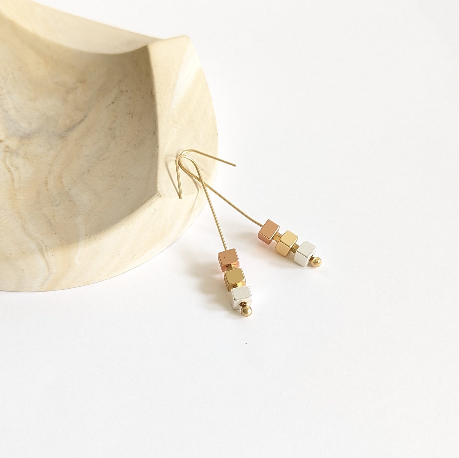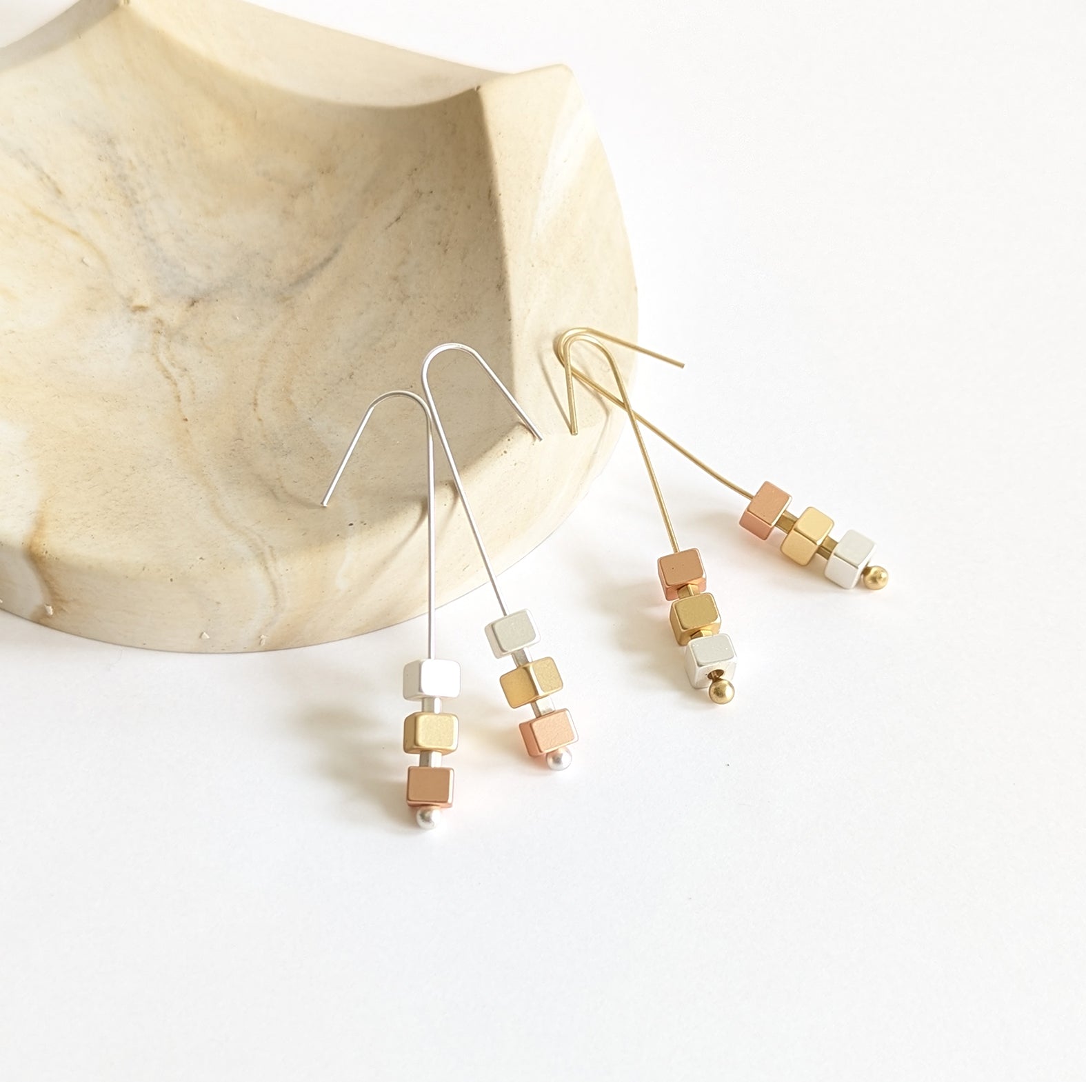 silver, gold, rose gold cube beads and spacer beads on long length straight hook.