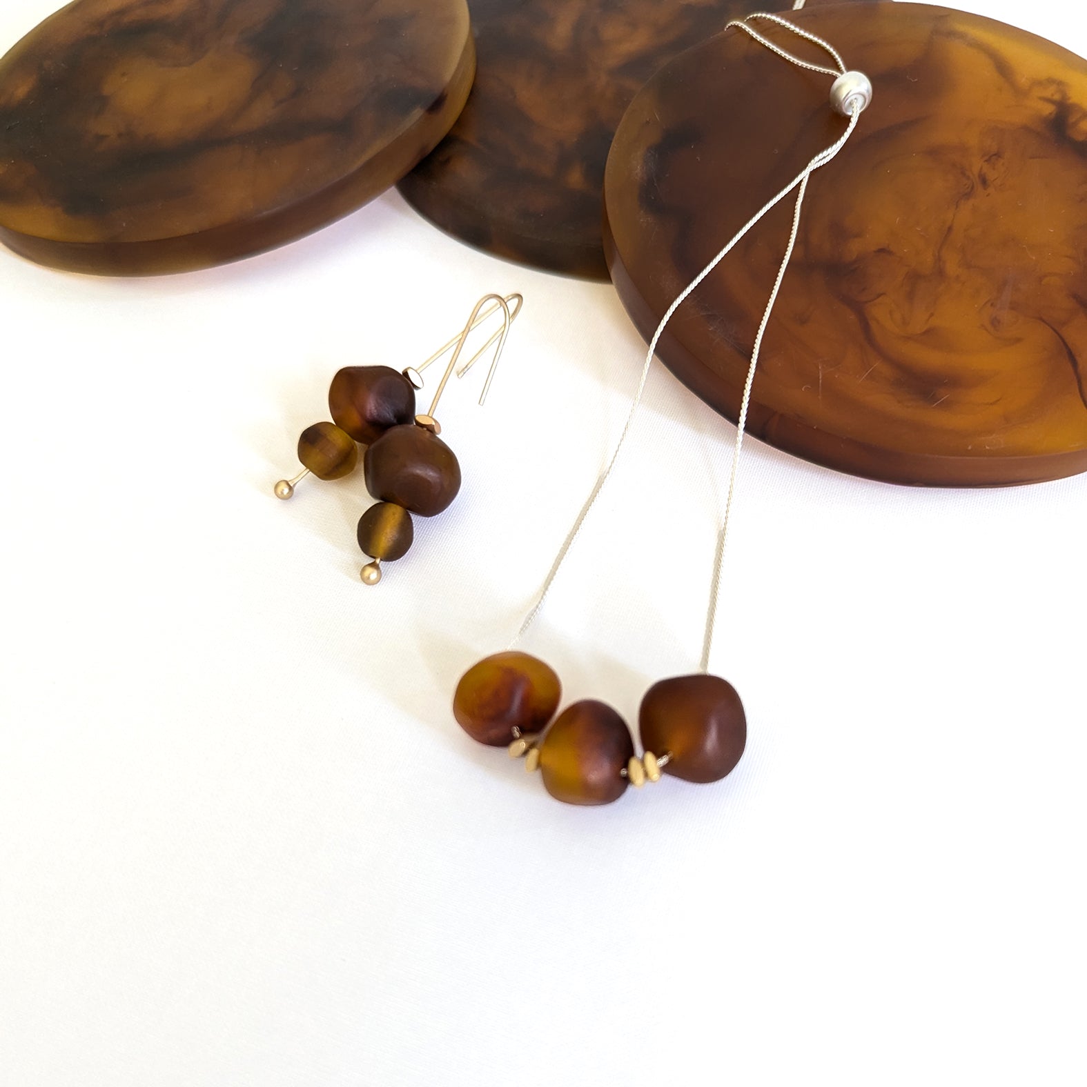 Handmade semi-transparent resin bead. Hooks and spacers are cast in brass (not nickel) and plated in matte gold. All plating is 0.5 – 1.0 micron thick.