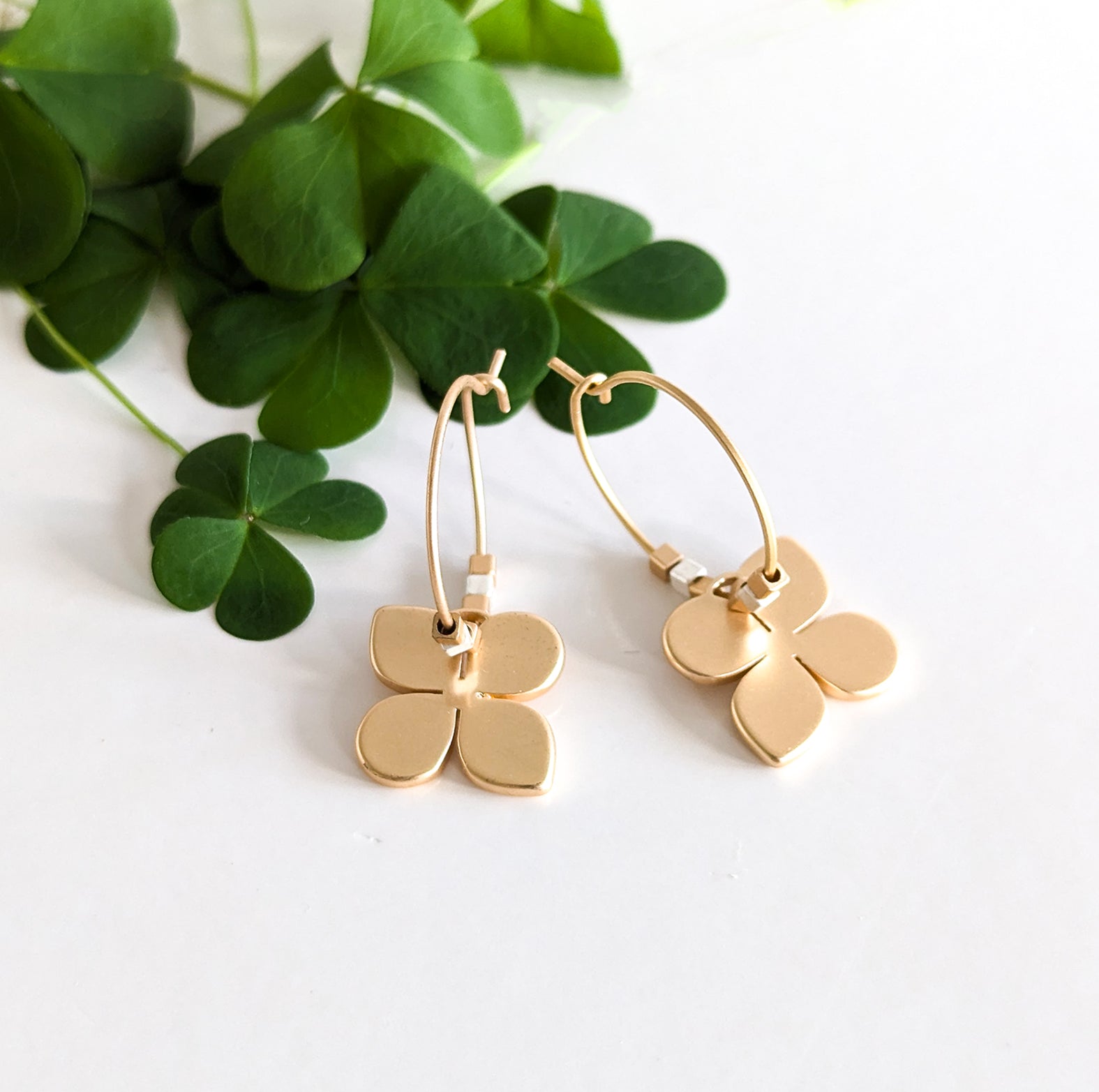 Gold clover flower + tiny cubes on small gold hoops