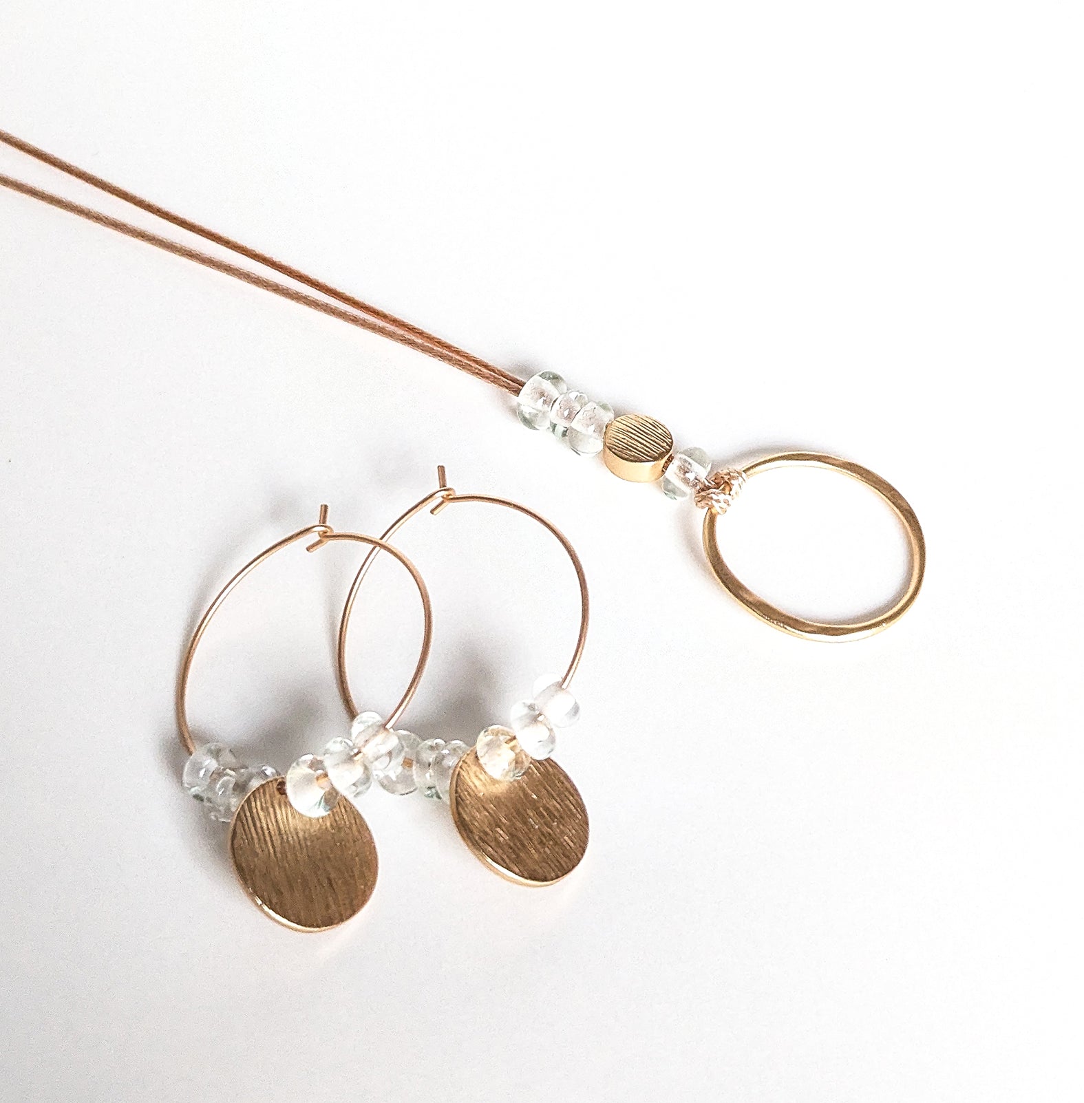 clear glass beads gold disc pendant on large gold hoops
