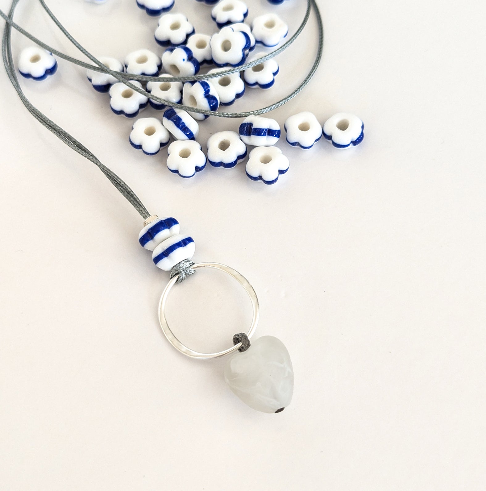 Clear swirl resin heart, white/blue glass beads, silver ring on grey cord