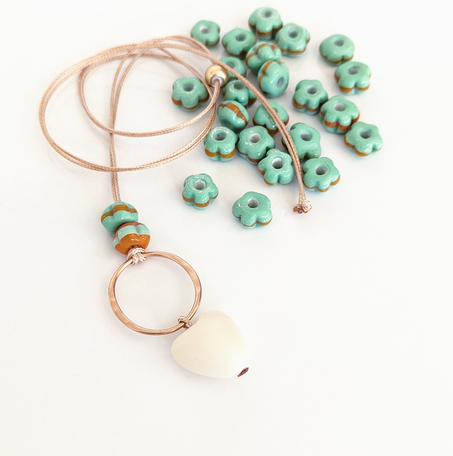 Hammered ring and adjustable ‘slider’ bead (controlling length of necklace) is cast in brass and plated in matte silver/gold at 0.5- 1.0 micron thick.