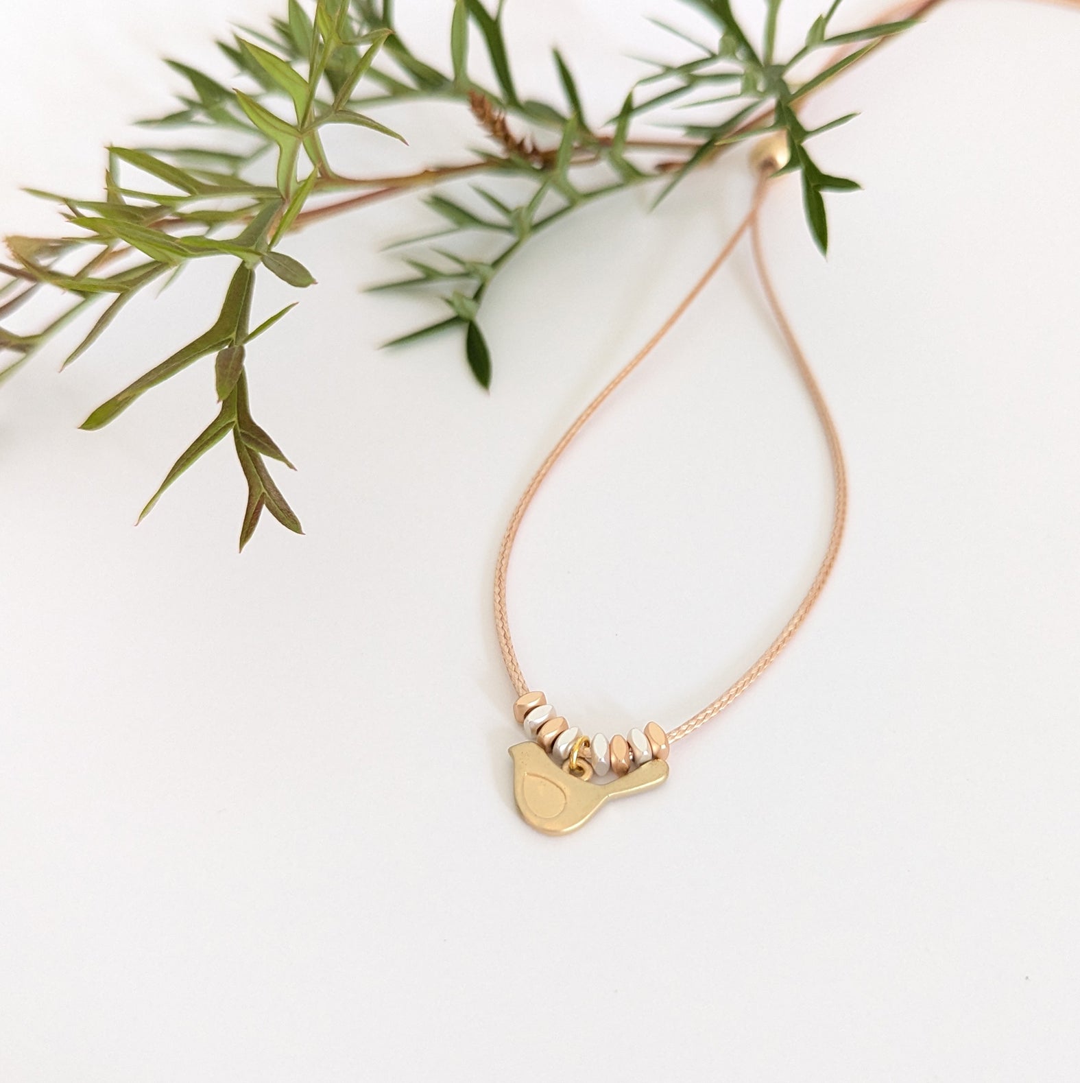 Bird feature pendant and beads are cast in brass (not nickel) and plated in matte silver / matte gold.