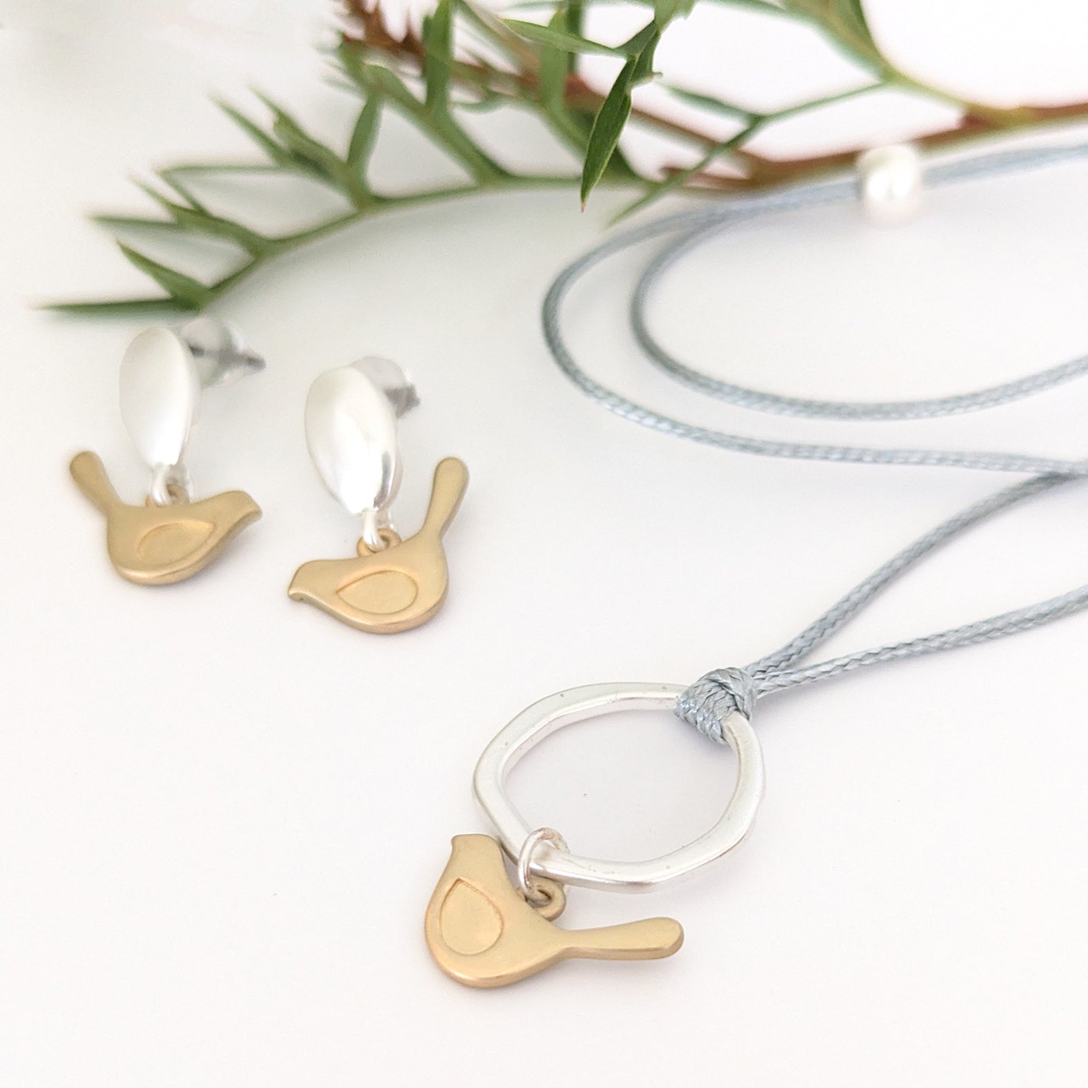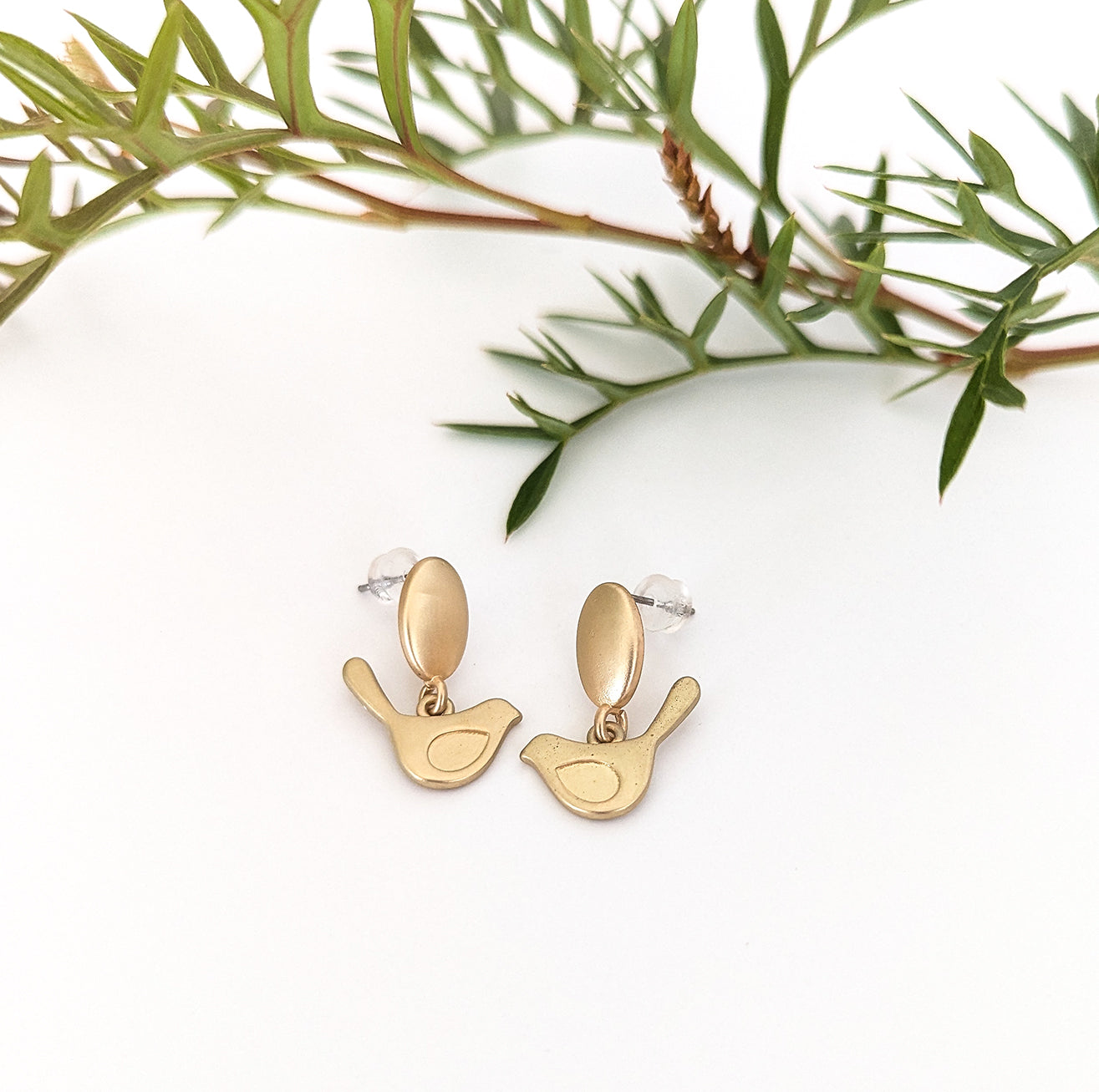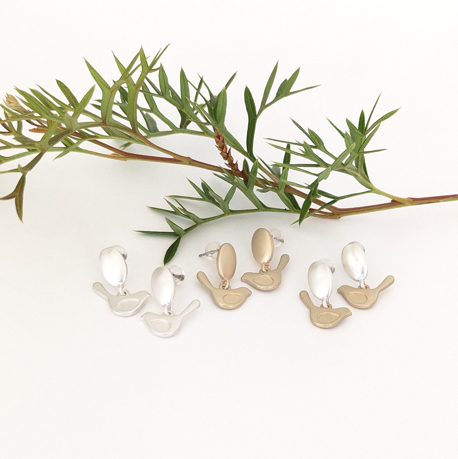Our oval stud with bird feature earrings are cast in brass (not nickel) and plated in matte silver and matte gold. (All plating is .5 – 1micron in thickness)