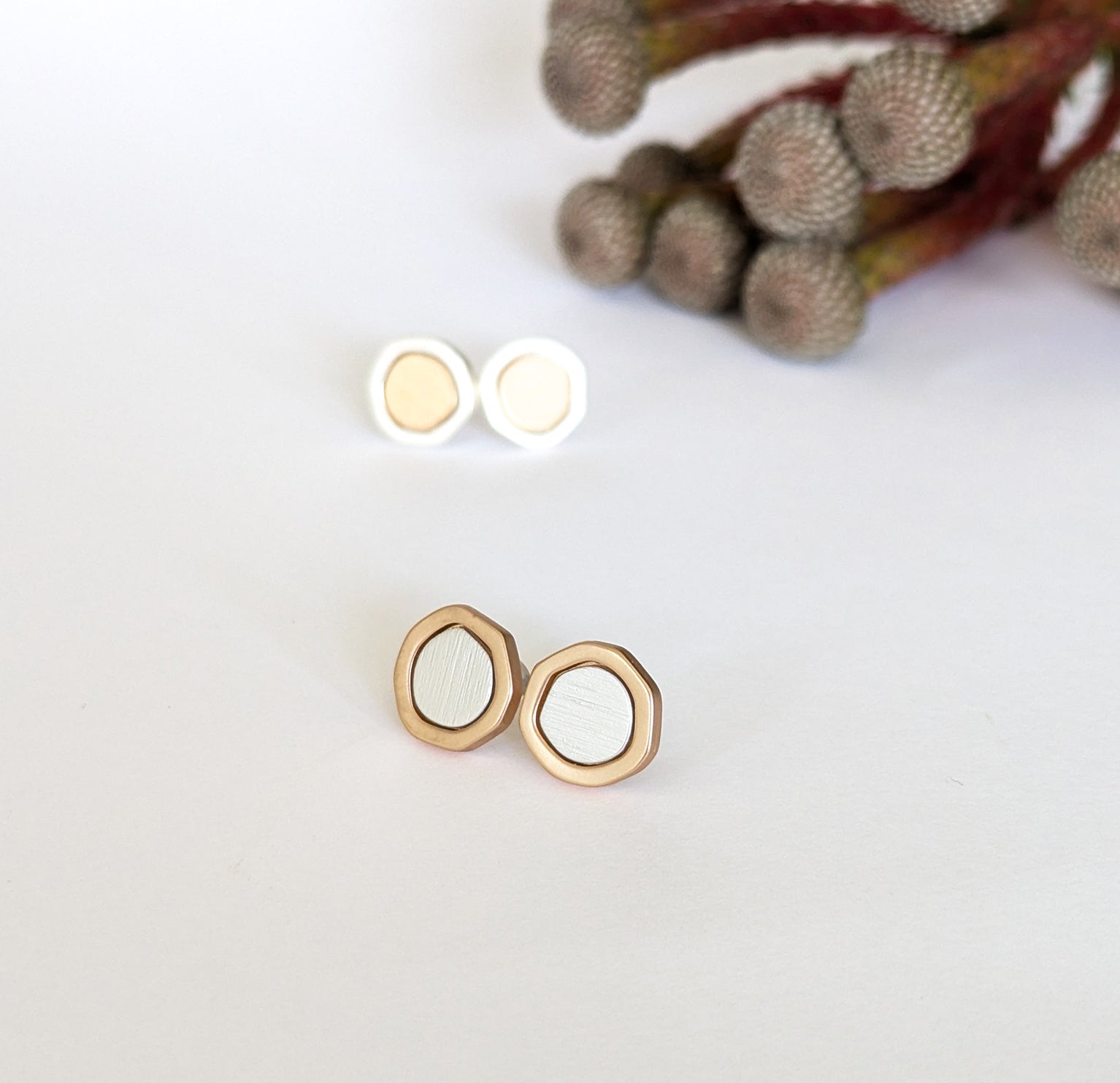 Studs fronts are cast in brass (not nickel) and plated in matte silver / matte gold. All plating is 0.5 – 1.0 micron thick.